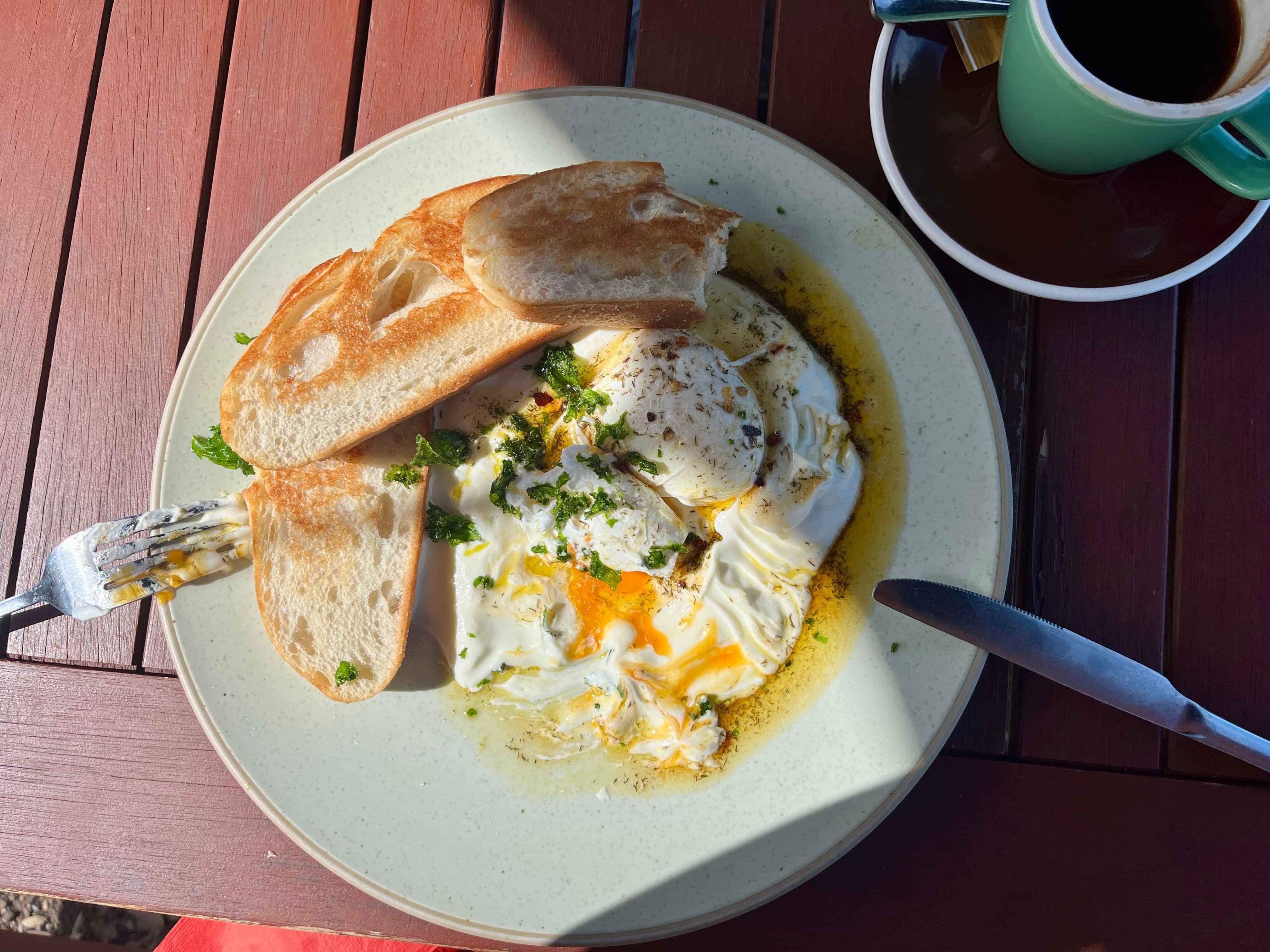 Recently I was enjoying a delicious breakfast in the morning sun. Two poached eggs, nestled in Greek yoghurt, dressed with a chilli brown butter sauce and fresh herbs, a couple of slices of toasted sourdough on the side.
